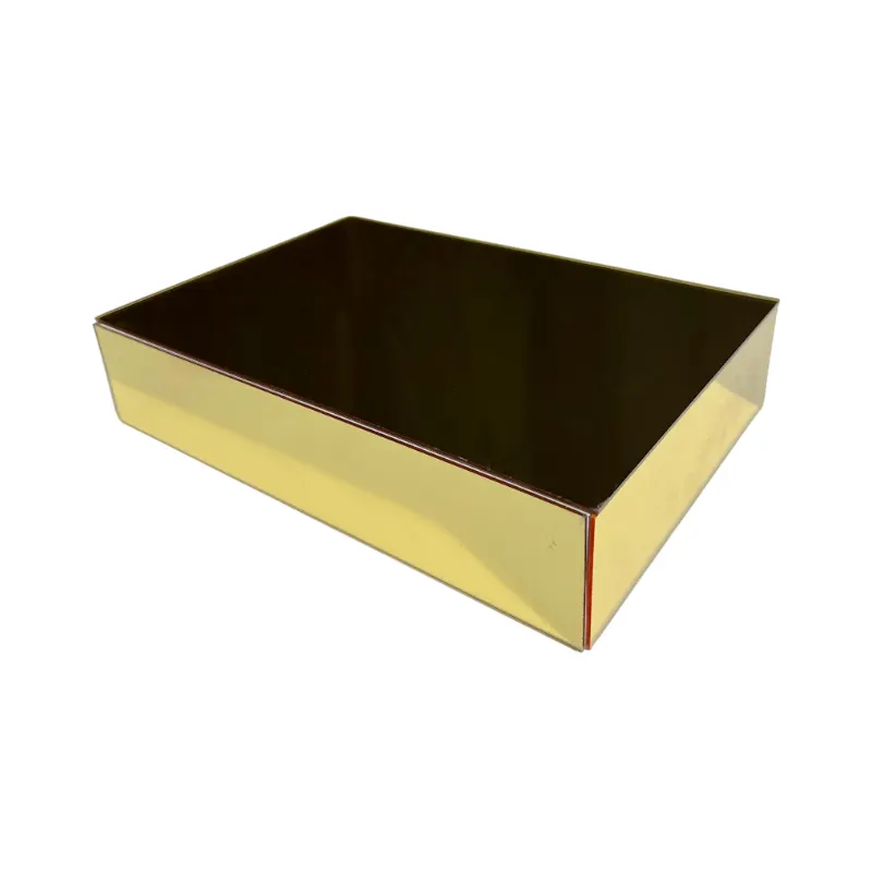 Esta elegante base para dulces presenta un diseño rectangular con acabado en espejo color oro, que aporta un toque sofisticado y brillante a cualquier evento. Su superficie reflectante realza la presentación de los dulces, creando un efecto visual atractivo y moderno.